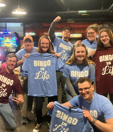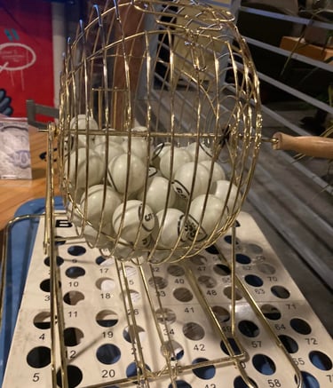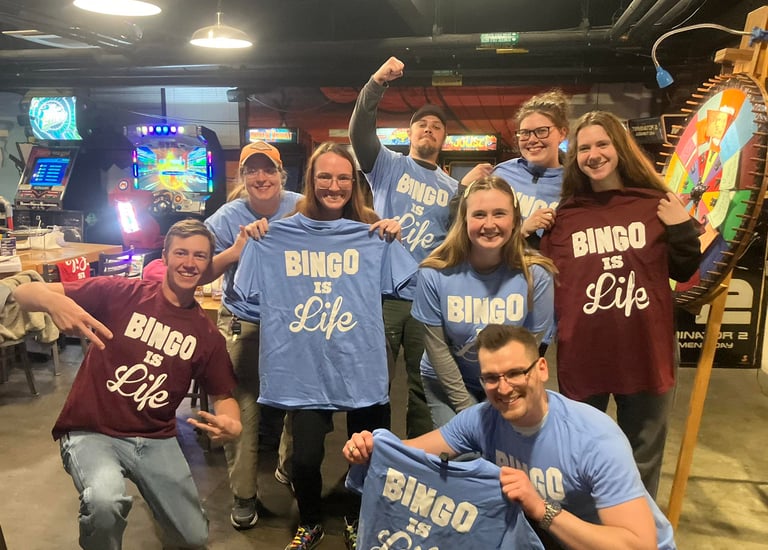 Each week on a Tuesday night at a basement bar in Harrisonburg VA we host a friendly little gameshow we call, Bingo Is Life! We spin the Wheel of Fate, we ponder the Skulls of Destiny, we unleash the potential of paper airplanes. And we sing about Bingo Heaven while we play Bingo.